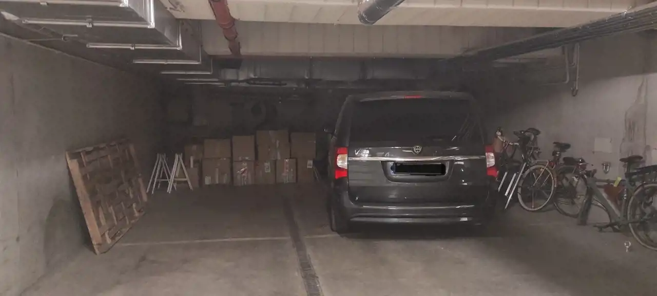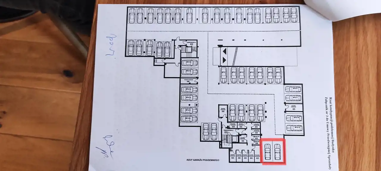 Dwa miejsca postojowe obok siebie we wnęce w garażu podziemnym budynku o łącznej powierzchni 48m2. Znajduje się tam również duża szafa 2m szer. x 1m głęb. x 2,2m wys. oraz regał, a także 3 grube mocowania ścienne do przypięcia rowerów. Miejsca postojowe dodatkowo płatne - 30 000 zł za sztukę.