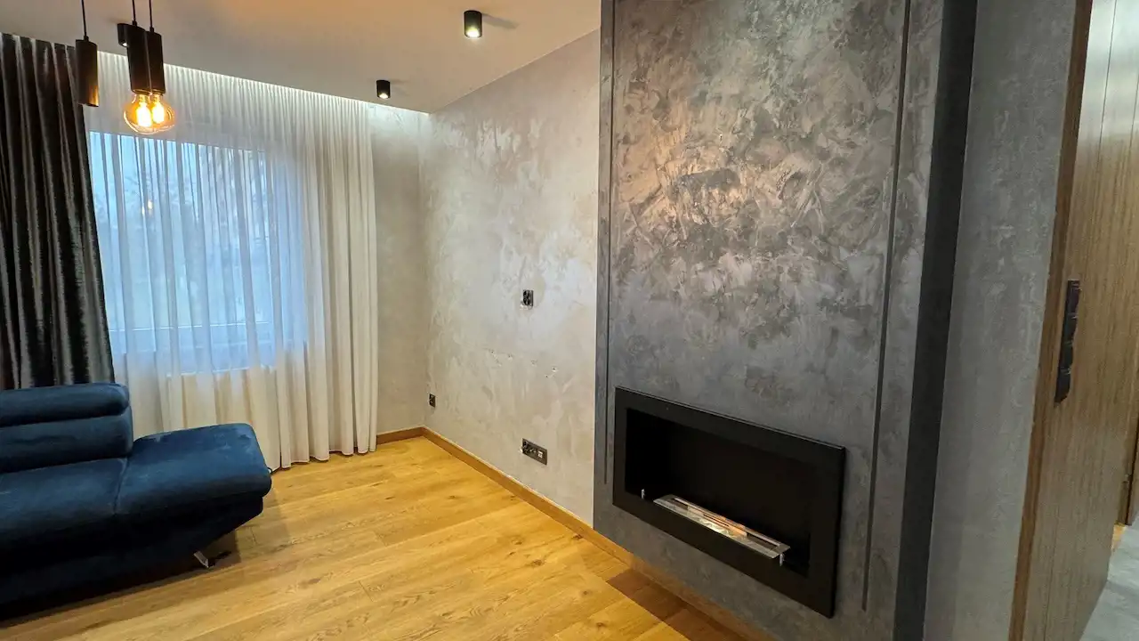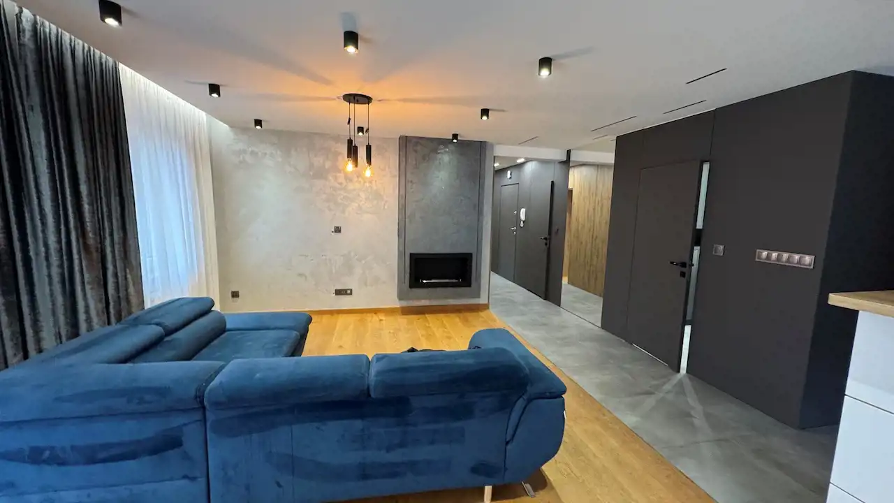 - Przestronny salon z aneksem kuchennym oraz biokominkiem, który wprowadza ciepły, rodzinny klimat,