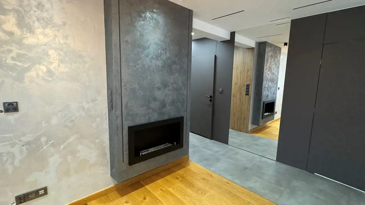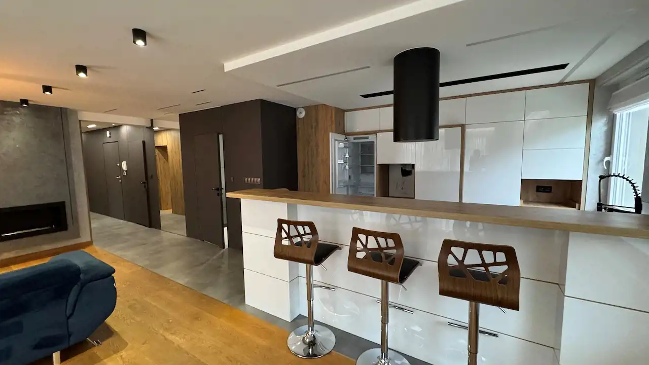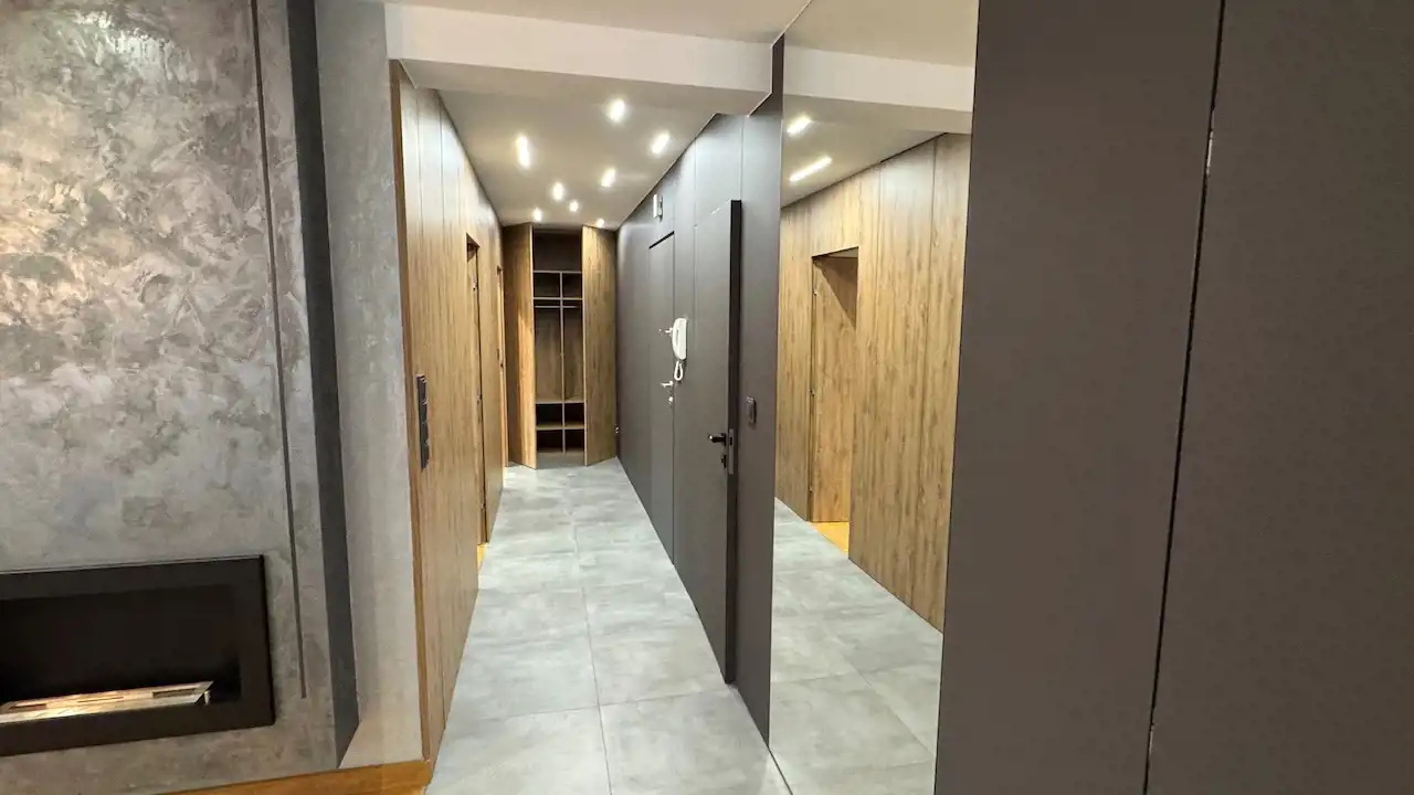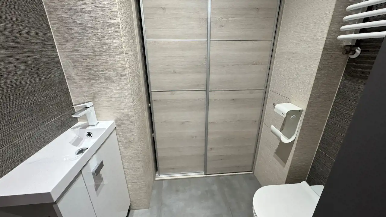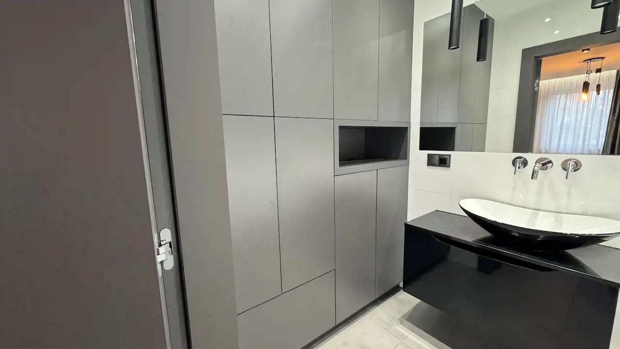 Mieszkanie zostało zaprojektowane z myślą o funkcjonalności. Ukryte szafy oferują mnóstwo miejsca do przechowywania, nie zabierając przestrzeni, co jest szczególnie ważne w przypadku rodzin.